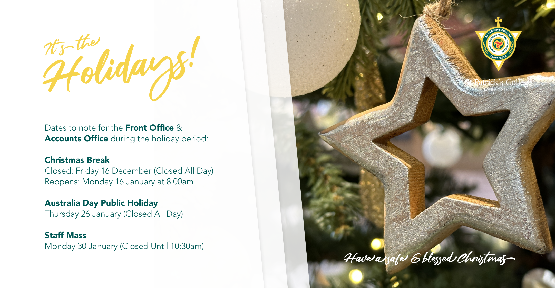 Finally, this is my last newsletter as Principal of St Patrick’s College - a truly amazing community of students, staff, Board, priests, parents and caregivers. I have been blessed by the support of all involved, and I thank you from the bottom of my heart. I could write a whole other newsletter thanking everyone individually. St Patrick’s College is one of the best Colleges I have had the privilege of working at and have been lucky enough to lead. Thank you for the memories.